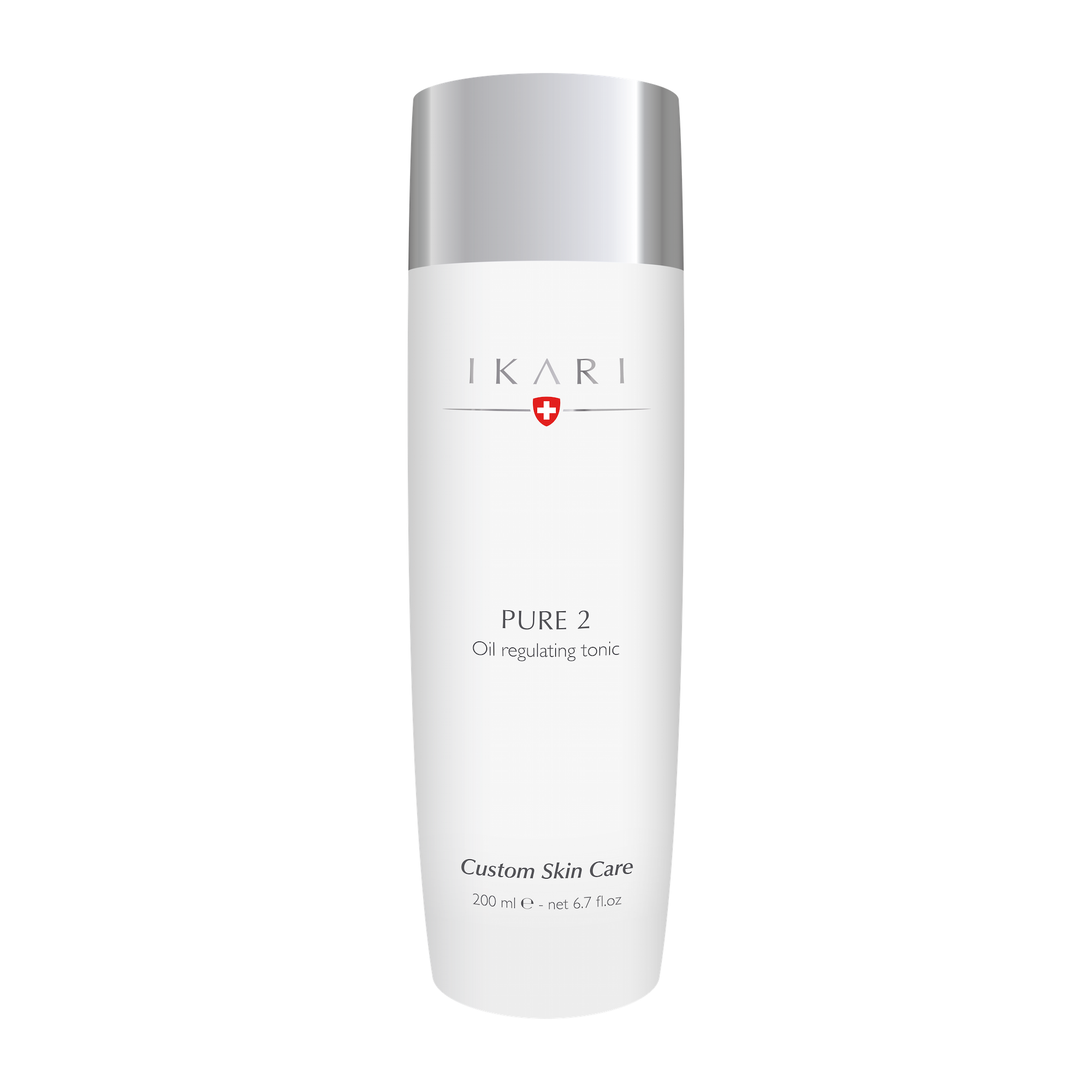 Ikari Pure 2 Oil regulating tonic. De Pure 2 is een vloeibare, transparante, natuurlijk geparfumeerde tonic. De tonic zuivert, desinfecteert de huid en sluit de poriën. Uiterst geschikt voor de vette huid, of de vette delen (T-zone) van de huid.