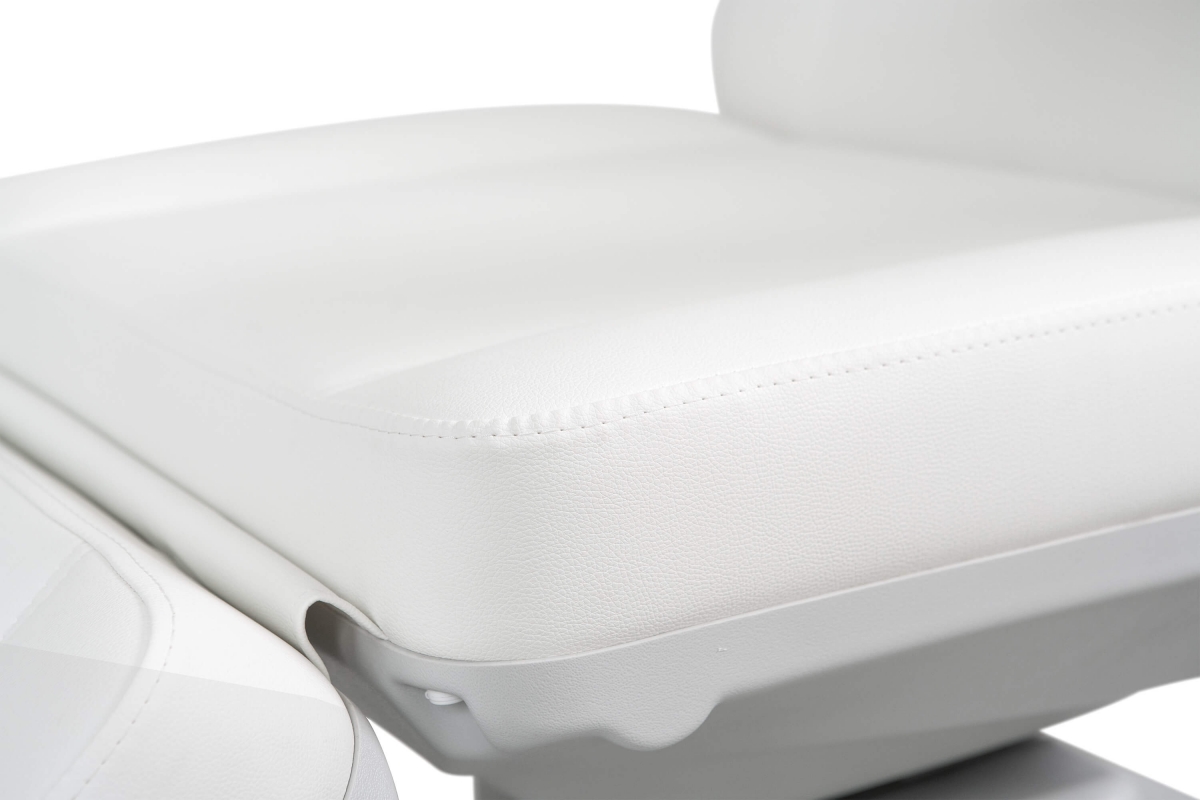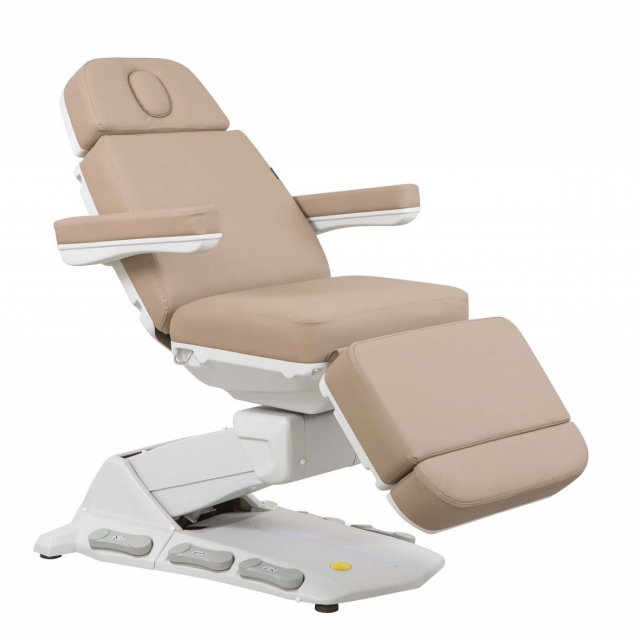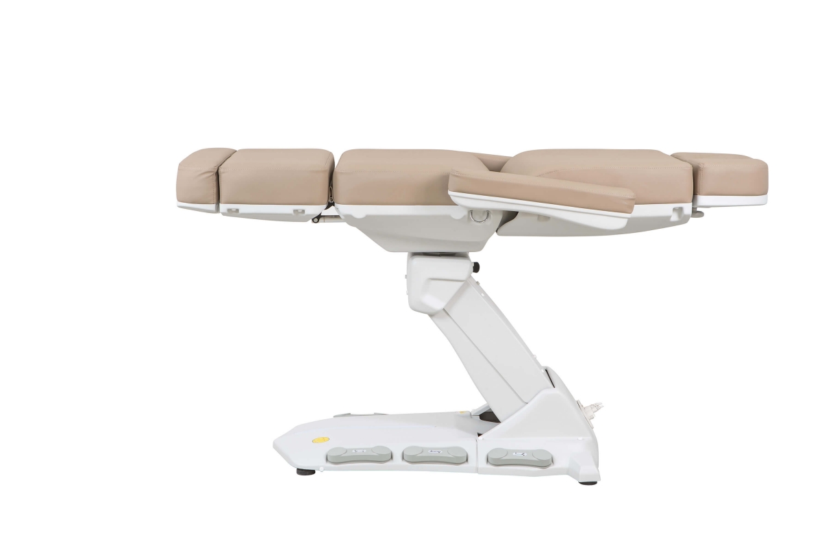 Moderne beauty allround behandelstoelstoel met verwarming en een zeer stabiele structuur, speciaal ontworpen om de werkruimte te optimaliseren dankzij de 110° rotatie. 4 motoren regelen de hoogte, de rugleuning, de zithoek en de voetensteun.
