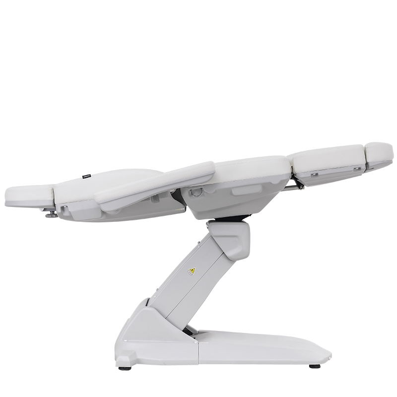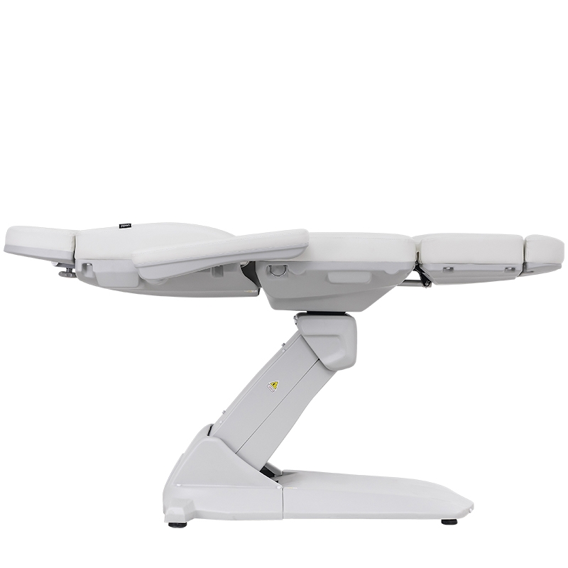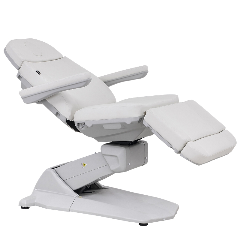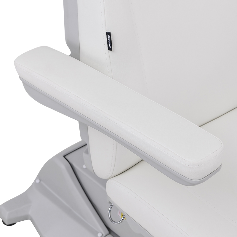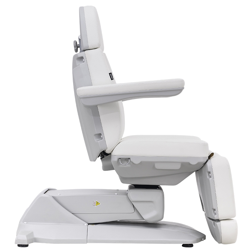 Moderne high-end behandelstoel met verwarming en een zeer stabiele structuur, speciaal ontworpen om de werkruimte te optimaliseren. Voorzien van 4 motoren die de hoogte, de kanteling van de rugleuning, de kanteling van de zitting en de voetensteun regelen. Inklapbare armleuningen. Hoogwaardige witte PU-bekleding.