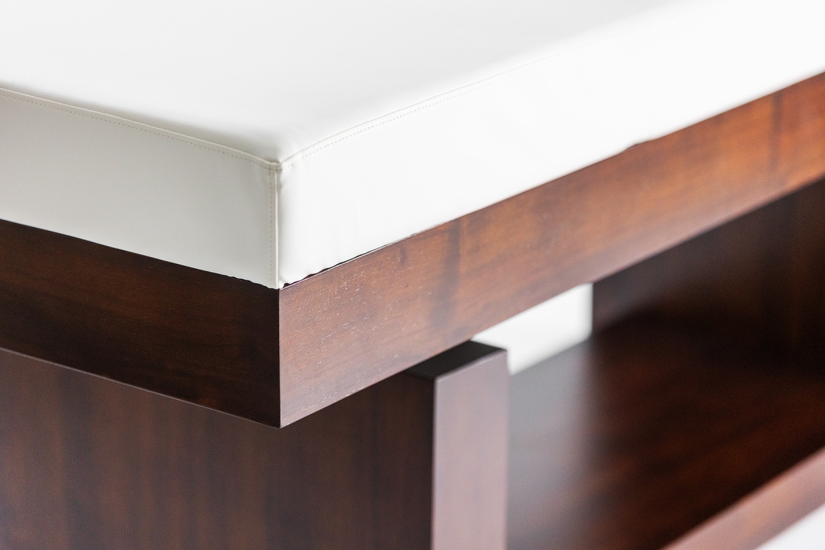 Spa Wellness behandeltafel MANAK heeft een eenvoudige rechtlijnige geometrie waardoor het er erg chique uitziet! Deze professionele elektrische spa-behandeltafel is uitgerust met 4 motoren voor elektrische hoogte-, rugleuning- en beensteunaanpassingen. Het mechanisme voor het verhogen van de rugleuning en de beensteun is sterk vervaardigd met stalen onderdelen en framestructuur. Onder de tafel bevindt zich een voetstuk voor open opbergruimte. Dankzij het speciaal vervaardigde ontwerp kan de therapeut zijn knieën onder de tafel plaatsen en heel dicht bij het gezicht van de cliënt werken tijdens gezichtsmassage of gezichtsbehandelingen. Er is een gezichtsopening en een gezichtsopening in de matras. We gebruikten voorgevormde polyurethaanmatrassen voor demping, zacht aanvoelend brandvertragend kunstleer, Italiaans PU of Aqua Base Coatings. Deze SPA behandeltafel is standaard uitgerust met verwarming.