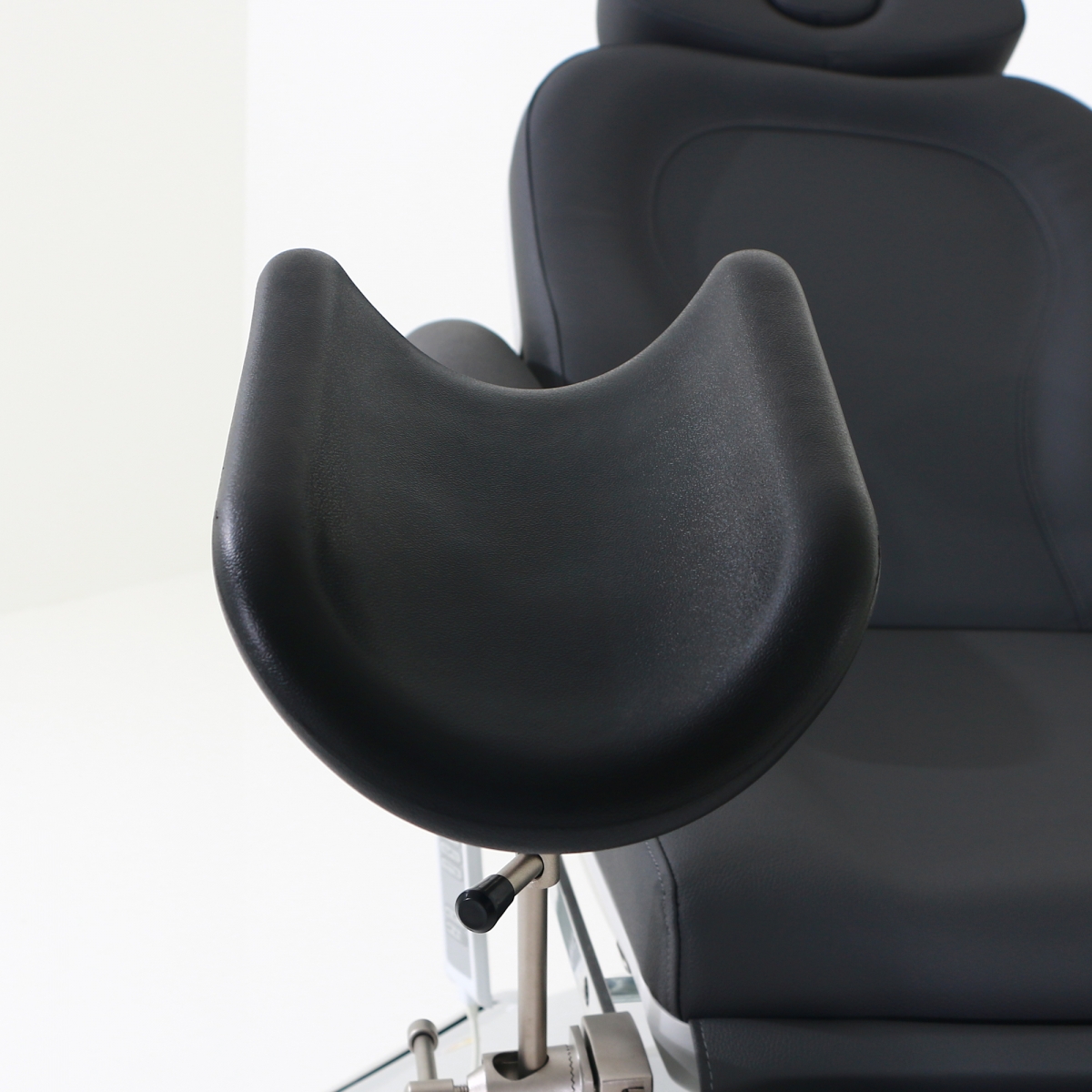 Hoogwaardige gynaecologie-stoel; stabiele structuur. Mede ontworpen om werkruimte te optimaliseren dankzij de rotatie van 120°. Vier (4) electro-motoren regelen hoogte, rugverstelling, trendelenburg en voetgedeelte. De electromotoren zijn geluidsarm.