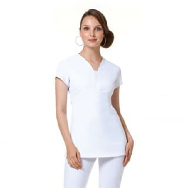 White bi-stretch schort. Onze elegante praktijkkleding is gemaakt van kwaliteitsstof, Bi-stretch. Dit is een zachte stof die mooi en flexibel is, het rekt zich uit in 2 richtingen. Het heeft een satijnen onderzijde die in contact is met de huid. Al onze kledij is ademend, zeer comfortabel tijdens het dragen en goed te reinigen. De productie- en levertijd van onze uniformen is 5 tot maximaal 10 werkdagen.