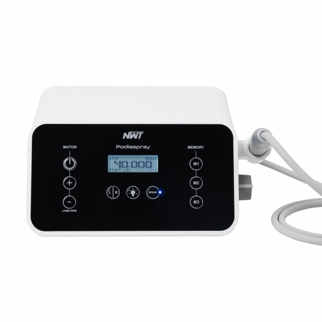 De NWT PodiaSpray is ontworpen voor professionals die op zoek zijn naar een lichte, compacte en gebruiksvriendelijke oplossing. Dankzij moderne, hoogwaardige componenten zoals de geavanceerde Pododent Evo-handstukken en borstelloze micromotoren van NWT, maakt deze unit dagelijks werken efficiënter en comfortabeler.