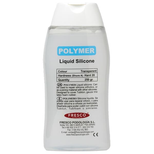 Fresco polymer liquid silicone shore 20. Vloeibare silicone, medium elasticiteit (Shore A 20). Vloeibaar en transparant, met lage viscositeit. Hardt uit bij toevoeging van katalysator tot een rigide en semi-transparante silicone. Kan gebruikt worden om orthesen te herstellen of als bindmateriaal met andere siliconen. Kan gebruikt worden voor het bedekken van Tubiton, Tubifoam, gaas, etc...